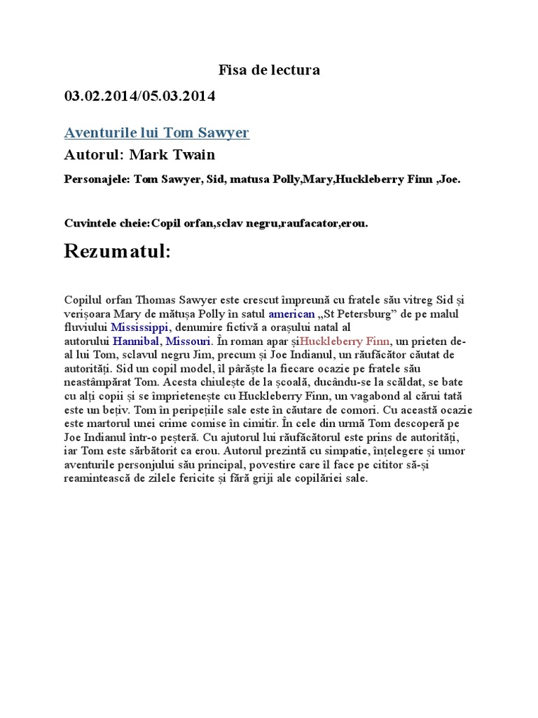 Fisa De Lectura Aventurile Lui Tom Sawyer