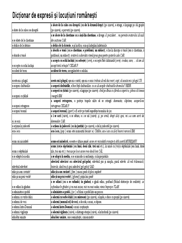 Dicţionar de expresii şi locuţiuni româneşti a abate de la calea cea dreaptă a se abate de la chestiune a abdica de la datorie a aborda o temă a accepta cu ochii închişi accident de teren acesta mi i plugul a acoperi cheltuielile a acoperi cu ţărînă a acoperi retragerea a acoperi terenul a i se acri a acţiona în. Vasile ilincan 6 intermediare nu are nicio importan ţă dac ă acestea sunt considerate expresii sau locu ţiuni. Dictionar de expresii si locutiuni romanesti 5143kdekmolj. Ex auribus sognoscitur asinus.