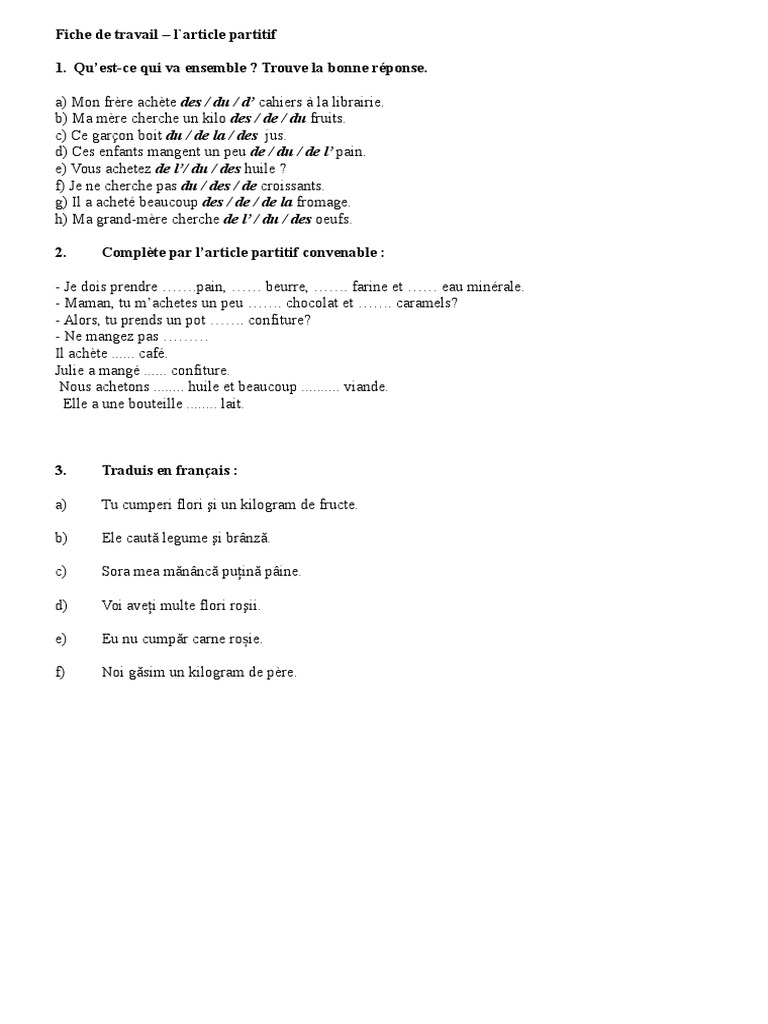 Fiche De Travail L Article Partitif